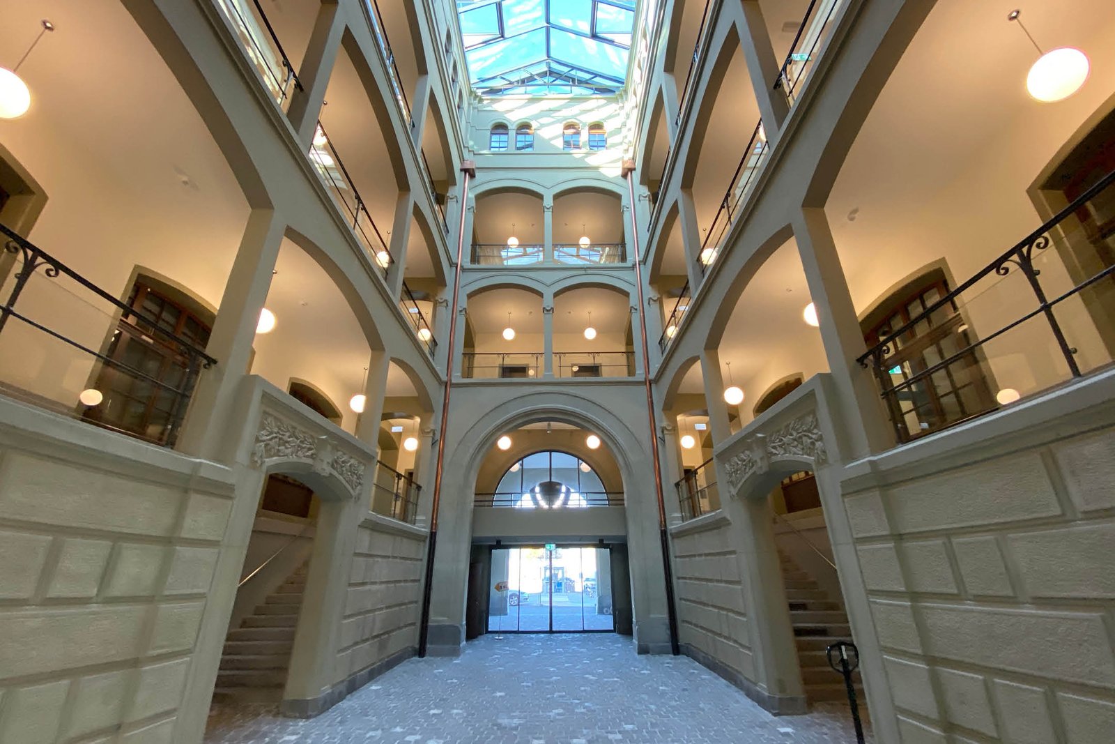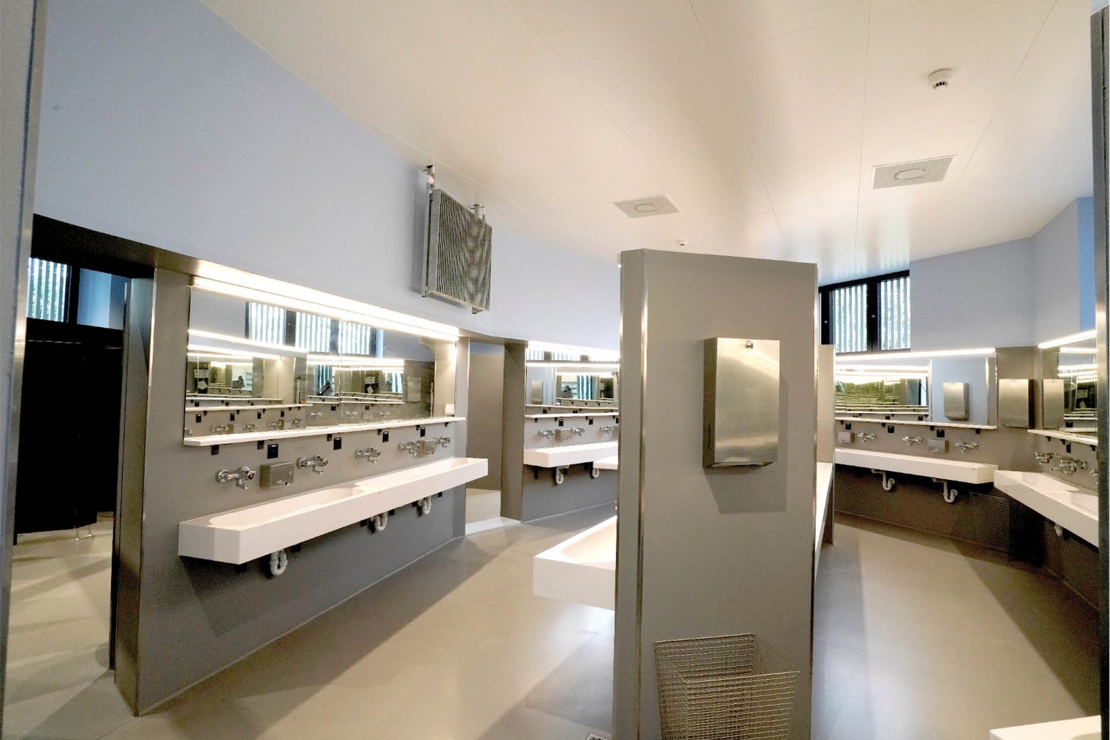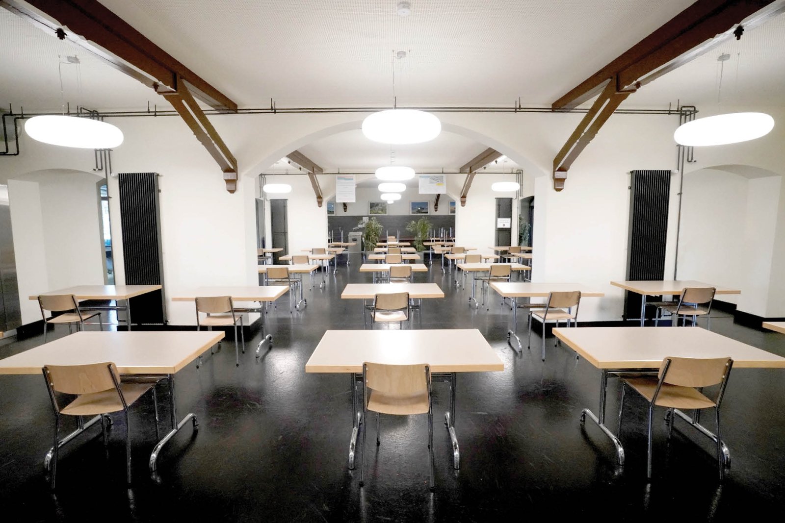 Im Erdgeschoss erfolgte der Einbau von vier Truppenküchen. Unter Berücksichtigung der denkmalpfl egerischen Anforderungen wurde der Minergiestandard umgesetzt. Die Sanierungsarbeiten erfolgten in zwei Etappen, wobei jeweils eine Gebäudehälfte während der ganzen Dauer der Bauarbeiten in Betrieb war.