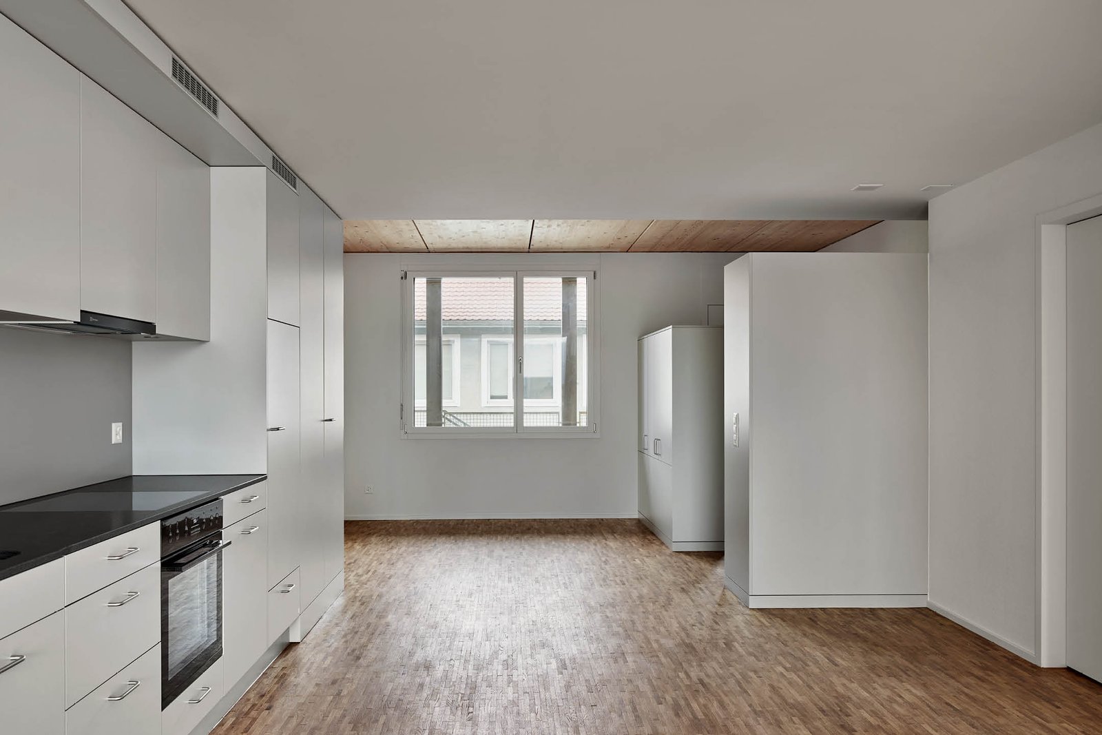 Die Küchen und Badezimmer wurden in Modulbauweise erstellt. Das heisst, sie wurden beim Schreiner in der Werkstatt gebaut und angeschlossen und komplett fertig auf die Baustelle geliefert.