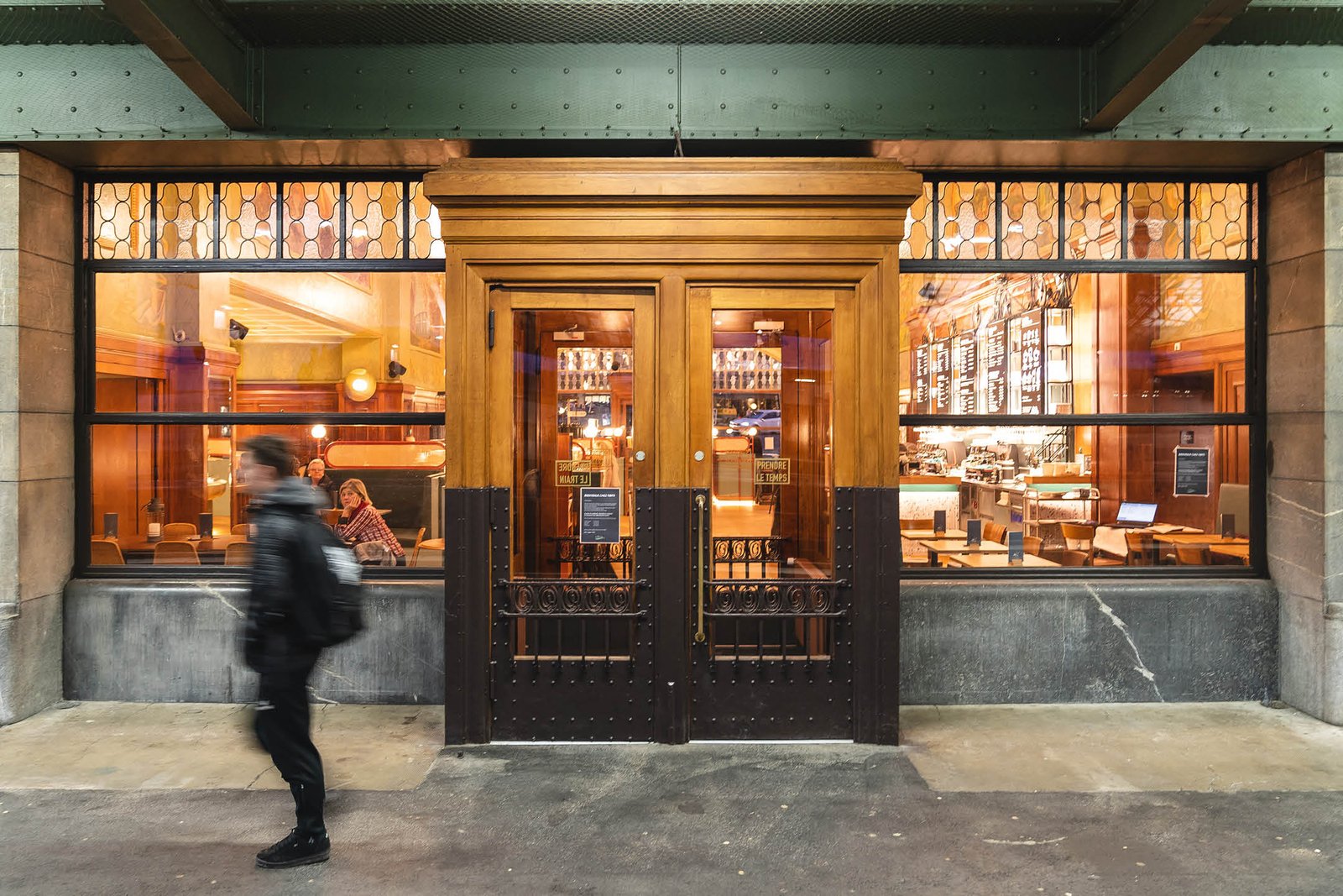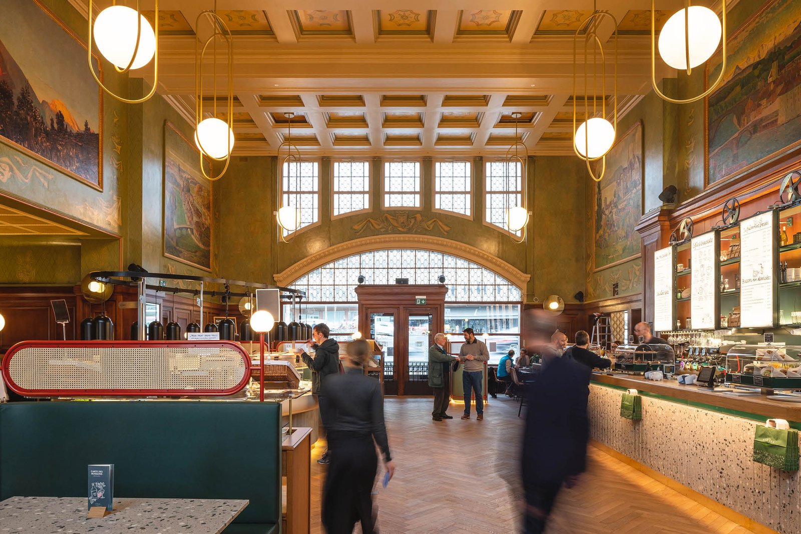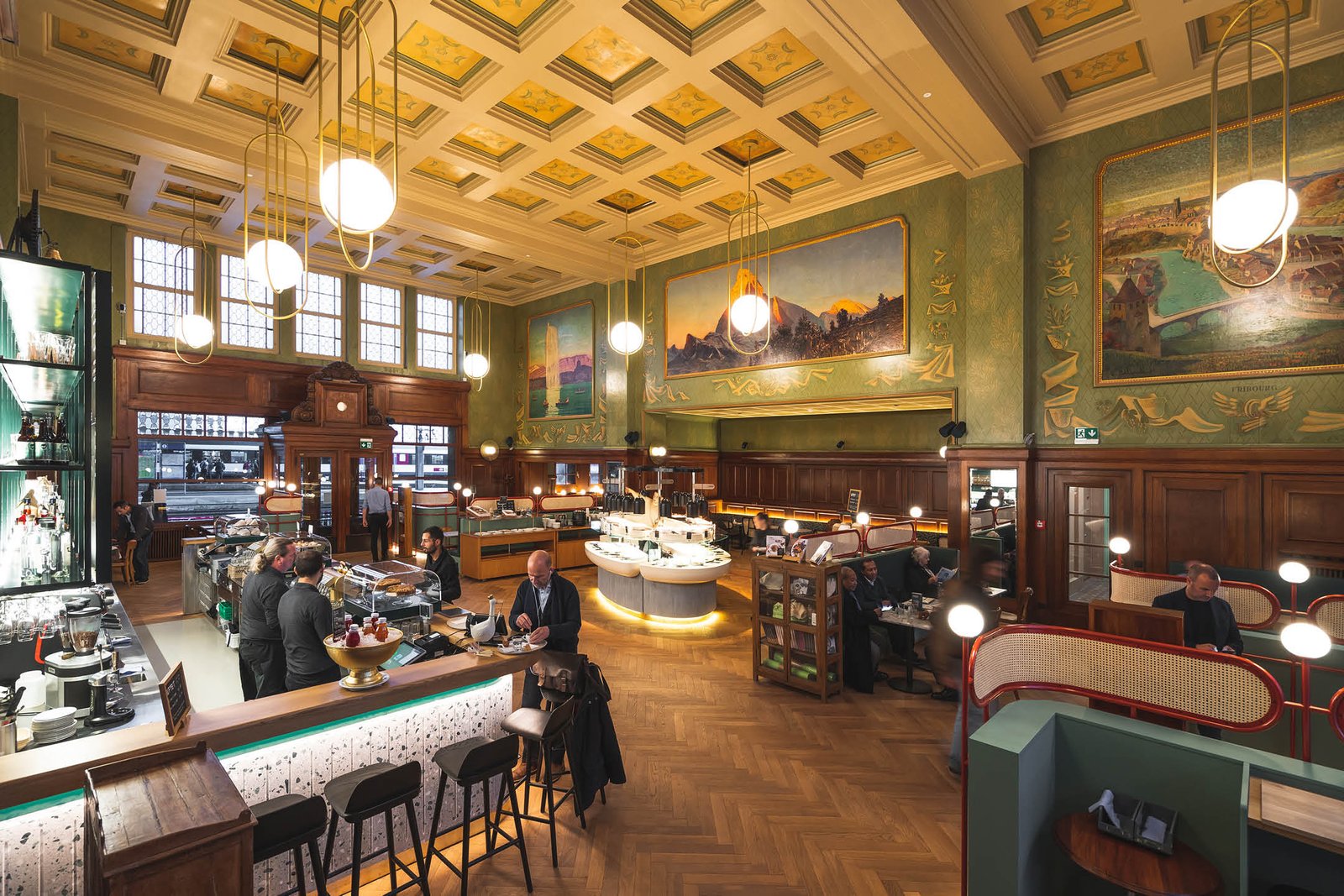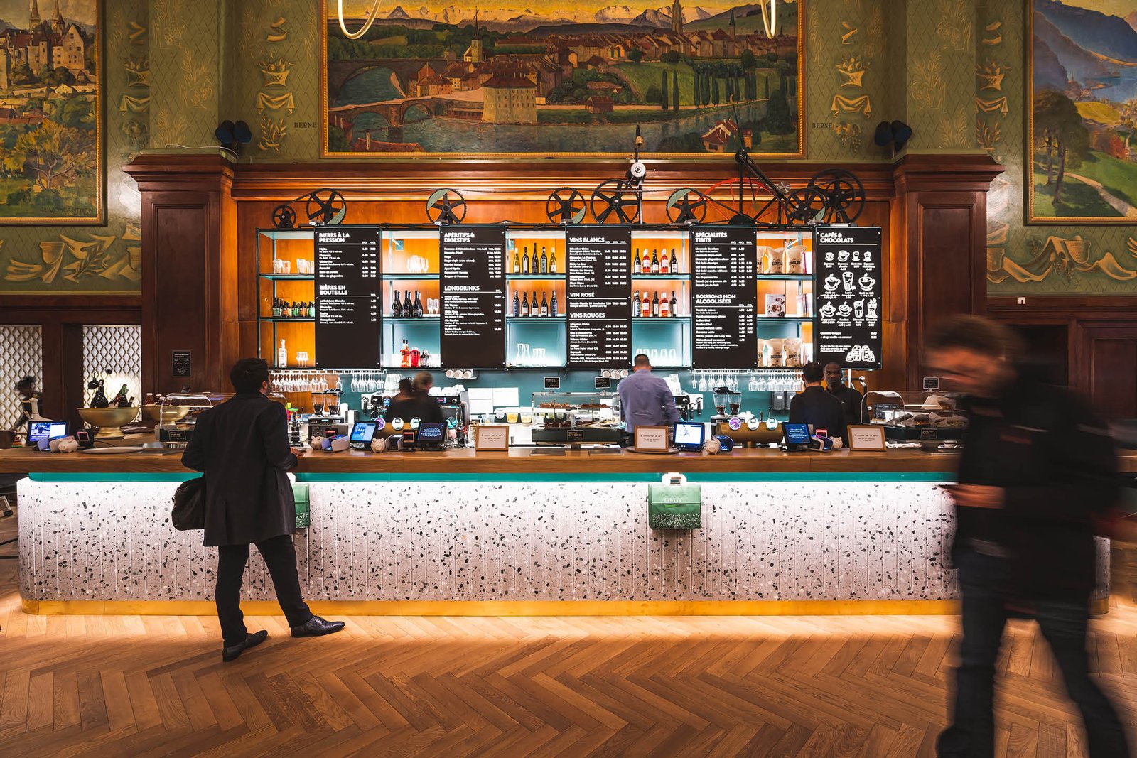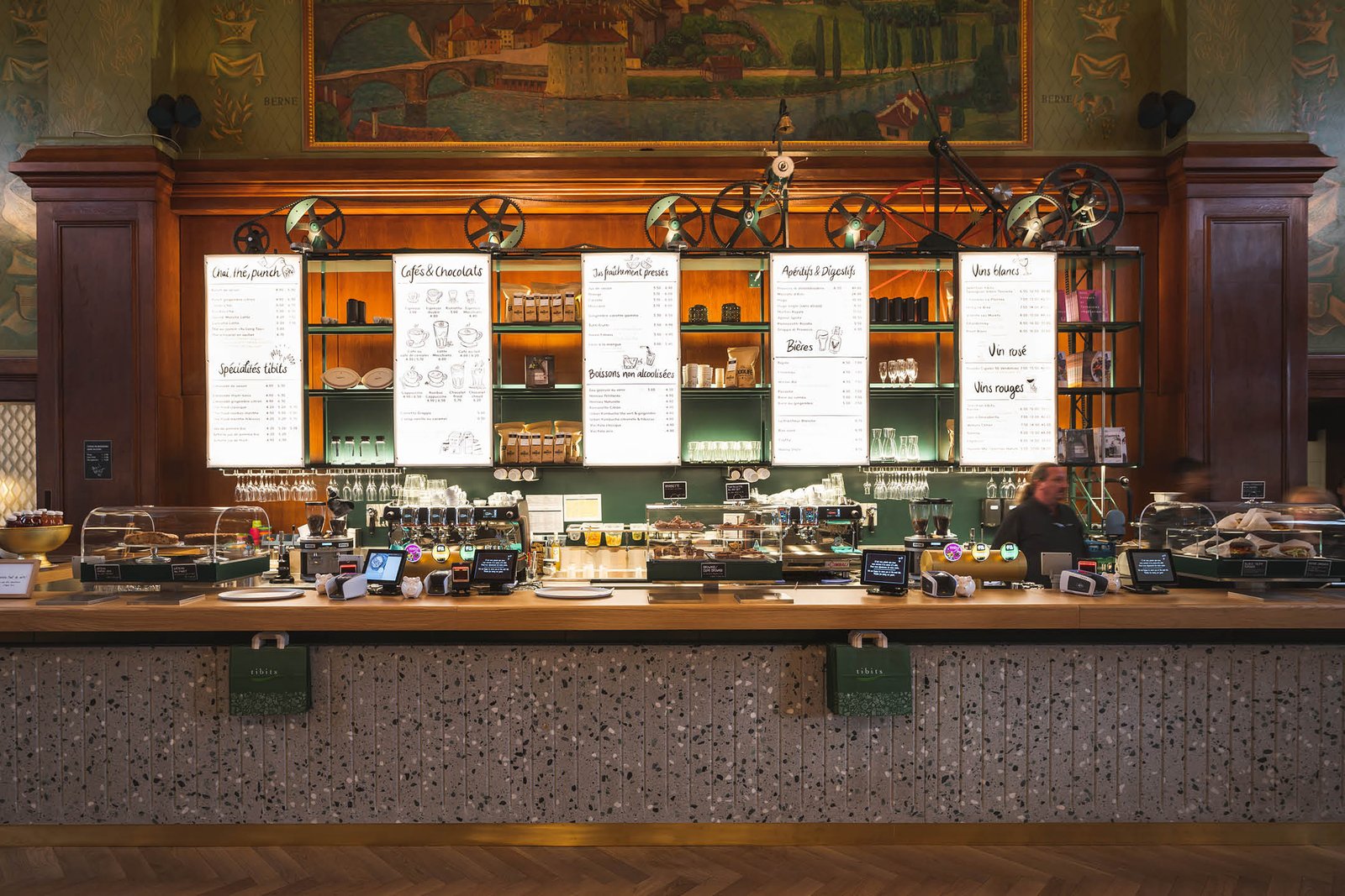 Im ehemaligen «Buffet de la gare» in Lausanne entstand eine neue Filiale der vegetarischen Restaurantkette Tibits. Die Innenarchitektur wurde auf die his- torische, hohe Halle abgestimmt.